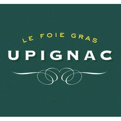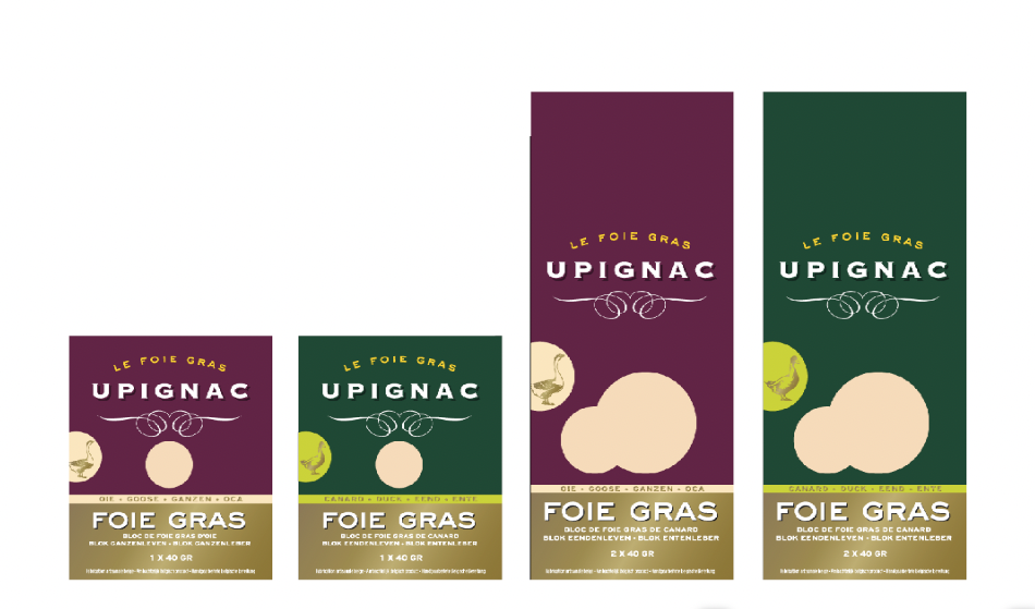 Les trois quarts du packaging sont dédiés à une couleur dominante liée au produit, accompagnée du logo Upignac sur fond foncé : vert sapin pour le canard, pourpre pour l’oie. Une bande de teinte plus claire précise l’origine du foie gras.