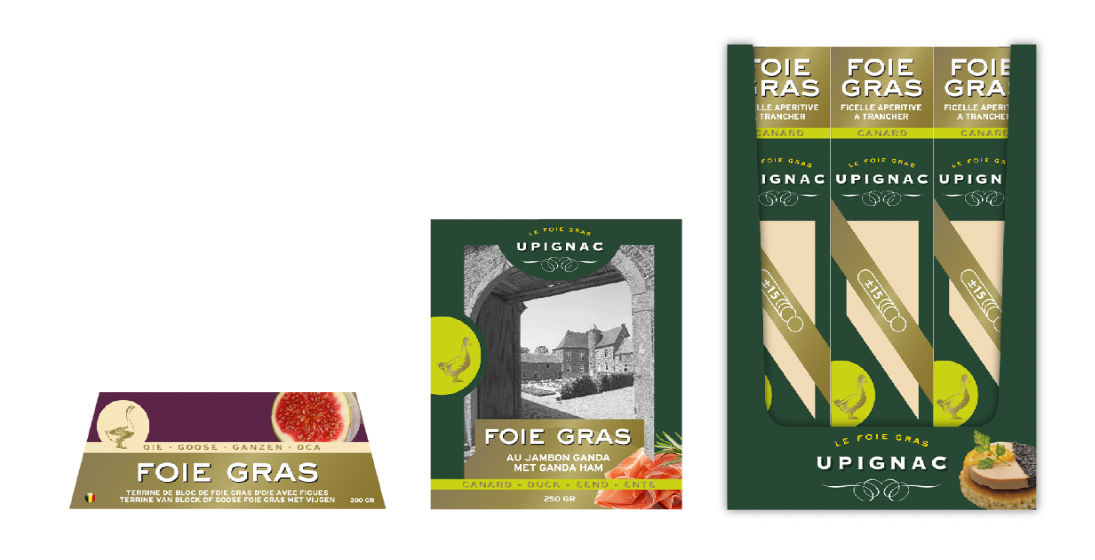 Repenser la gamme de foies gras Upignac afin de clarifier la lecture des produits et de distinguer visuellement les foies gras de canard et d’oie. L’enjeu était d’améliorer la lisibilité en rayon tout en renforçant la cohérence et l’identité de la marque.